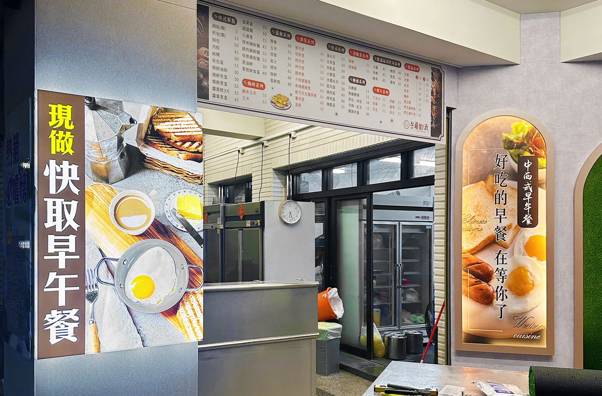 店面空間設計概念本店秉持「早晨拾光」的主題概念,舒適與溫馨的空間設計,顧客踏入欣賞一日的美好開端。採用現代簡約風格,佈置輕巧的燈光,突顯招牌菜色的美味,同時兼具中式與西式早餐元素的展示,完美樹立餐飲文化與誠意。整體空間強調顧客體驗,以獨特的動線設計和開放式廚房為特色,讓顧客處於輕鬆的氣氛中,普遍我們對新鮮與現場製作的堅持。整體設計以自然色調為基礎,搭配溫暖的燈光與食物展示,表現中西餐的餐點特色,營造一個既具設計感又舒適的用餐環境。顧客在用餐視覺、嗅覺與味覺上全方位的早餐美好時光。