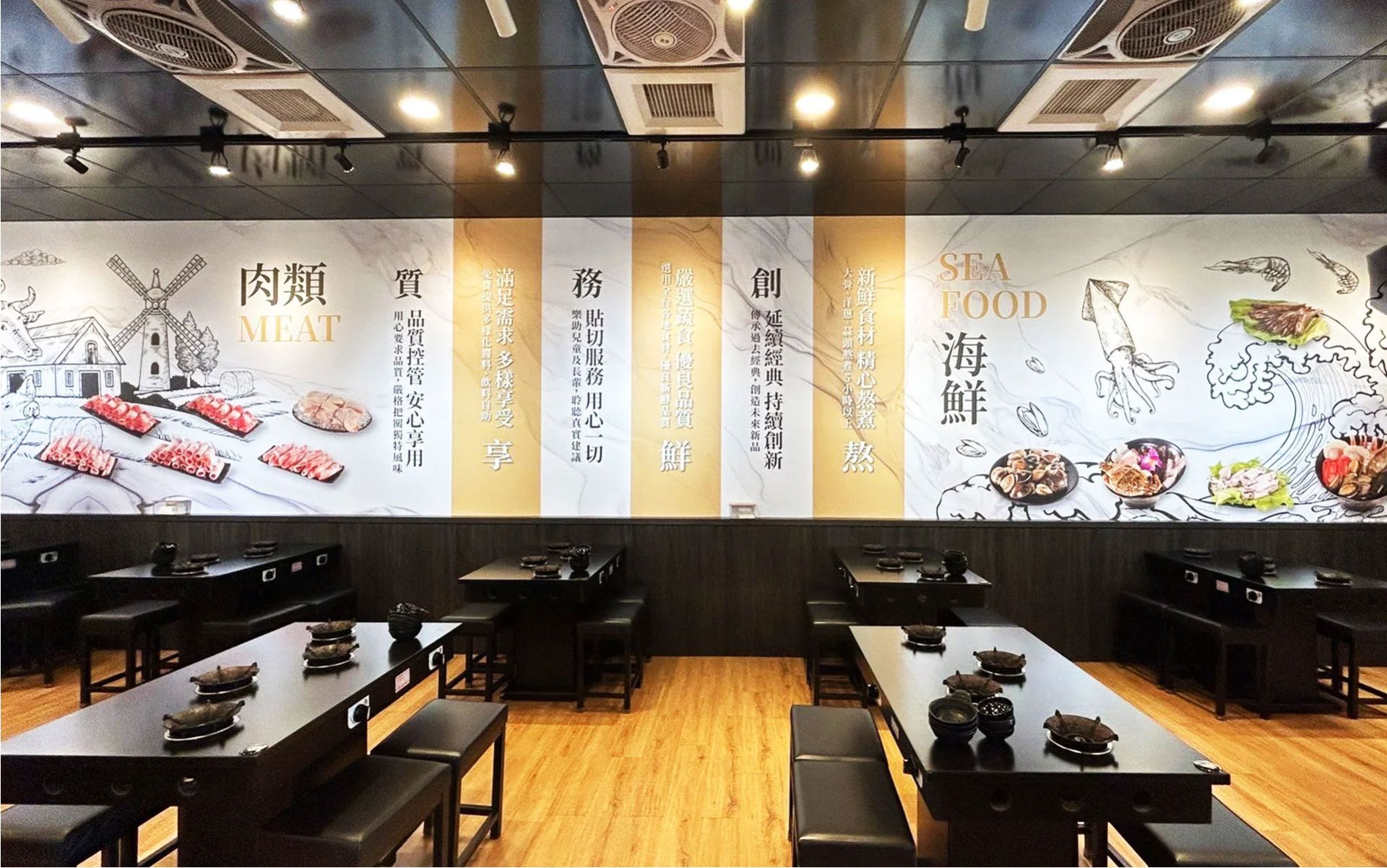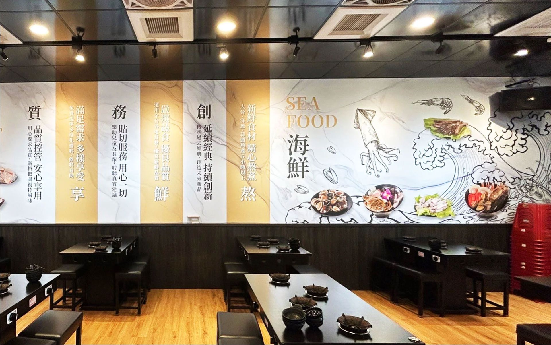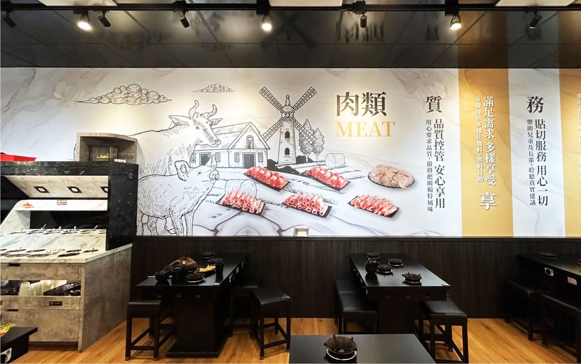 店面空間設計概念融合實物與插畫的趣味性,以肉類、海鮮類、食品的圖片作為核心元素,搭配生動的插畫表現形式,實現現實與創意的完美結合。這種手法不僅能展現食材的鮮美與豐富,同時增添趣味性與視覺吸引力,給人留下深刻印象,打造品牌親和力。底紋的大理石紋理以其簡約大器、自然高雅的質感,成為畫面設計的理想背景。不僅提升了整體畫面的質感與層次感,還與食品的高品質形象相呼應,傳遞出專業、信任與品味的信息。